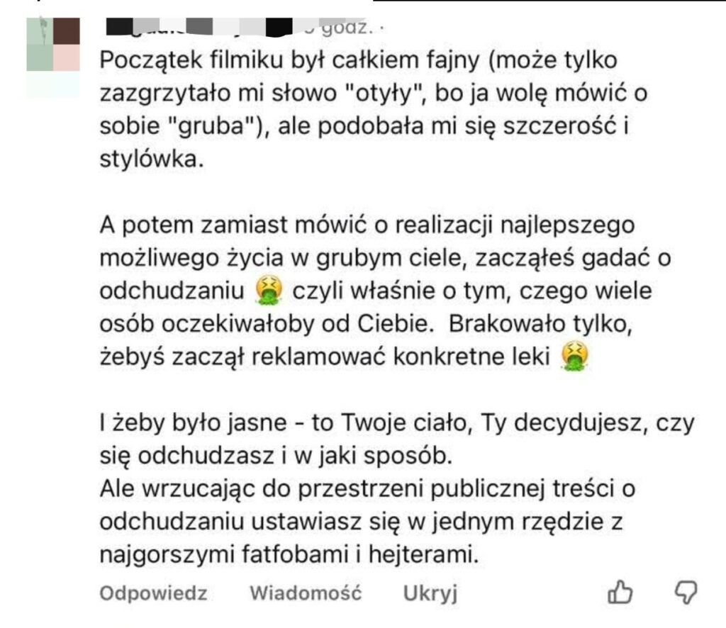 „Co to za ściek? Nie, nie ma granicy między ciałopozytywnością a szurią, bo to pojęcia z różnych porządków, a nie z jednego spektrum. Ciałopozytywność oznacza tylko, że niezależnie od wyglądu swojego ciała każdy człowiek zasługuje na szczęście, szacunek i możliwość samorealizacji. Ba! Chorzy (nie tylko na otyłość!), niepełnosprawni czy dotknięci kryzysami zdrowia psychicznego ludzie również na to zasługują! […]”.