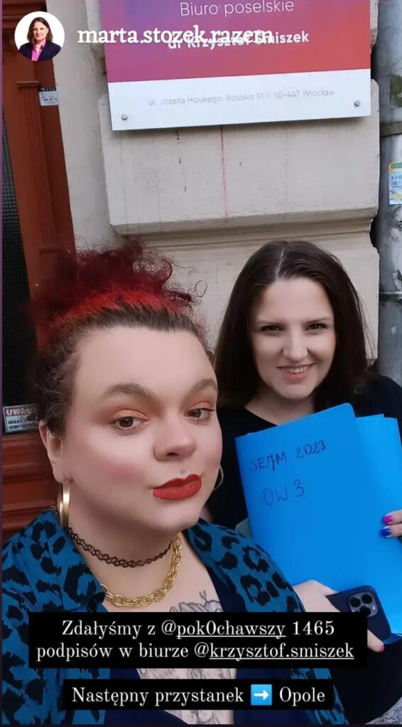 Jako jedna z założycielek Oleśnickiego Strajku Kobiet aktywnie działam na rzecz praw kobiet i walki o równość. Do naszych sukcesów można zaliczyć protesty po wyroku TK z 2019, które zgromadziły wiele mieszkanek naszego miasta; regularną współpracę z organami lokalnymi, takimi jak Rada Miasta, nagłośnienie na skalę ogólnopolską sytuacji związanej z nękaniem lekarzy i pacjentów PZS w Oleśnicy przez aktywistów antyaborcyjnych oraz przyczynienie się do wydania zakazu zgromadzeń pod tą placówką medyczną.